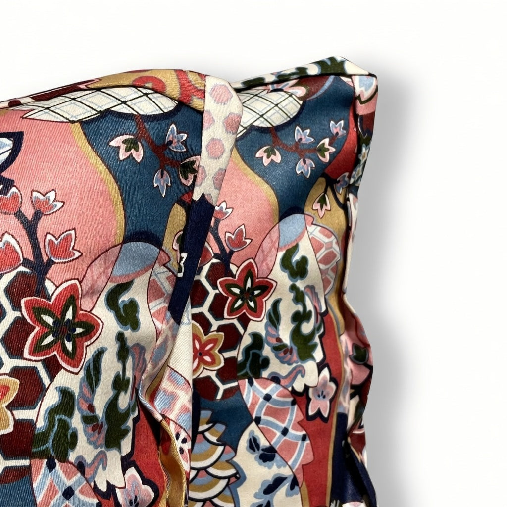 Design: Exclusive Japanese floral pattern in vibrant pink, blue, burgundy, and multi-tones.