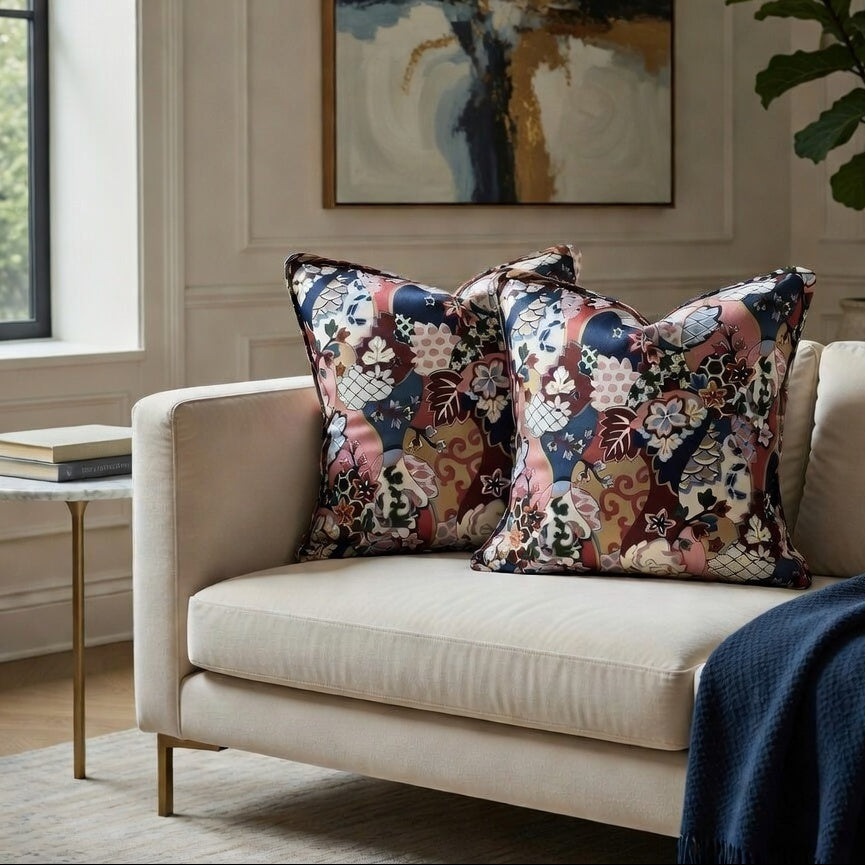 Elevate your home decor with this exclusive set of 2 pillow covers measuring 40x40 cm, crafted from premium 100% natural cotton. Ultra-soft, breathable, and featuring a stunning Japanese floral pattern in vibrant shades of pink, blue, and burgundy — blending modern elegance with a unique boho-oriental vibe.